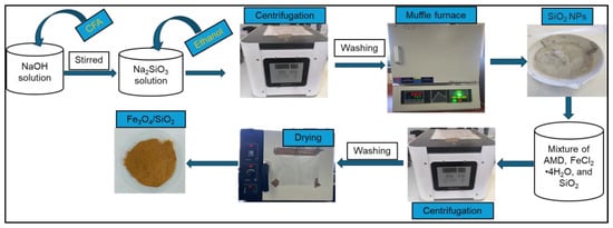 Silica nanoparticles (SiO2 NPs) are known to be stable with a high surface area, which makes SiO2 NPs a good adsorbent [22]. However, SiO2 NP adsorption capacity for DCF is generally limited since there is a lack of necessary adsorptive sites for effective interaction with pollutant molecules [23,24]. On the other hand, Fe3O4 exhibits excellent magnetic properties, facilitating easy separation of the adsorbent from the aqueous solutions. Nonetheless, Fe3O4 alone may agglomerate and lower the surface area [25], consequently reducing the effectiveness of Fe3O4 as an adsorbent. Integrating SiO2 NPs with Fe3O4 forms a composite that results in a high surface area and with magnetic properties [26]. This composite can provide more adsorptive sites for adsorption. It is crucial to explore various waste materials and convert them into valuable products. High surface area and magnetic properties allow the Fe3O4/SiO2 composites to effectively remove organic contaminants such as dyes, heavy metals, and pharmaceuticals, which could work well for DCF removal from water [27,28]. Furthermore, Fe3O4/SiO2 nanocomposites have been broadly explored for drug delivery [29].