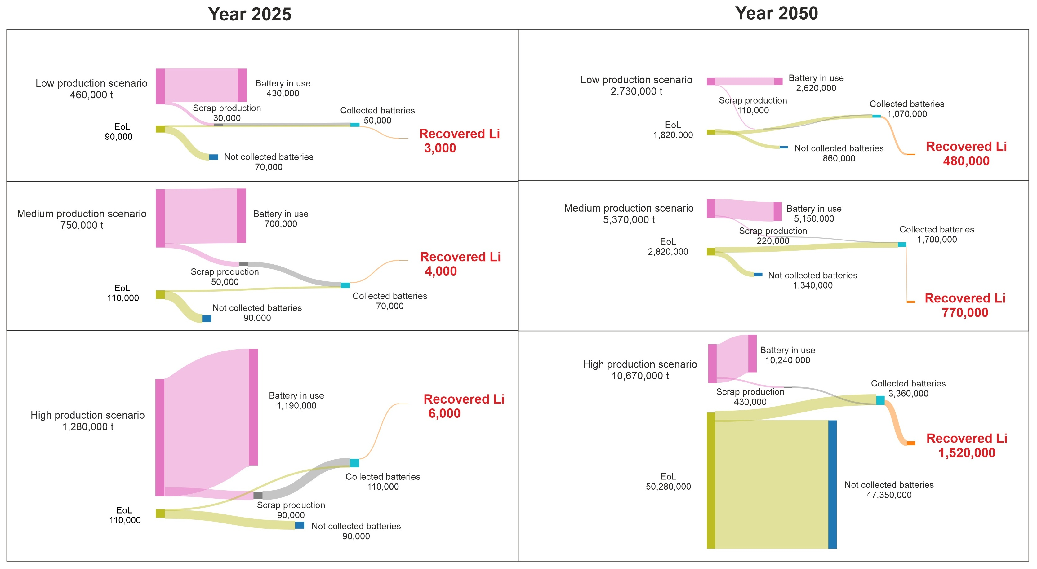 - Battery production: Future battery production scenarios are highly uncertain. This is why we used three cases in this study, without specifying the relative probabilities of each of these cases. Globally, battery cell production capacities for LIBs have been between 700 and 800 GWh for the EV sector in 2024 [48]. Current battery cell production for the EV sector in Europe amounts to around 190 GWh/a [48]. Both figures, global and EU, approximately correspond to the production capacities in the low production scenario (Figure 7 and Figure 8). Comparing actual tracked capacities in the literature with simulated production capacities in each scenario globally and on the EU level, the low production scenario is probably most realistic to happen in the short- to mid-term future. Especially the recent slowdown in EV sales and cancellations of battery cell factories in the EU underpin this assumption [49,50]. The uncertainty in the production scenarios naturally increases the further projections are made into the future. However, we note that the final results of expected recycling rates by 2050 do not differ substantially between scenarios and are only slightly higher in the low-production scenario compared to the medium- and high-production scenarios. Therefore, the substantial uncertainty in future production growth does not translate to similar uncertainties for expected recycling rates.
