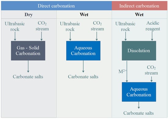 Mineral carbonation can be a direct or an indirect process (Figure 1). Direct mineral carbonation may occur either in gaseous or aqueous media. Depending on this, it is referred to as gas–solid (dry) or aqueous (wet) mineral carbonation. Dry carbonation is a simple process in which gaseous CO2 reacts directly with solid alkaline minerals. However, it is relatively slow, and pressure and/or heating should be applied to improve its efficiency [53]. Moreover, when a serpentine sample was used, as a chromite mining by-product, an efficiency of 0.07 g CO2/g was obtained by applying 200 °C, 25 bar, and 10% v/v H2O in 1 h. It was also reported that up to 10% v/v H2O presence in the CO2 stream may increase the sequestration yield. Water forms CO2 reactive intermediates that favor the formation of carbonates. A higher vapor percentage leads to competitive adsorption mechanisms [54].