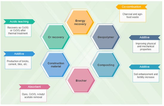 In addition to energy and chromium recovery, tannery sludge has been studied in various implementations aimed at its valorization (Table 8). As mentioned before, it was used as an additive in brick production, which poses two advantages: energy savings and waste recycling. However, as the process produces building material, the quality of the final product should not be affected by the addition of sludge. It has been proved that a content of 10 wt% tannery sludge in clay-based bricks may produce a product that fulfills the quality standards [78]. Another factor that was taken into consideration, since tannery sludge is a waste, was the immobilization of its pollutants. According to the leaching tests (e.g., TCLP), the concentration of the extracted pollutants, mainly metals, was well below the regulation limits [97].