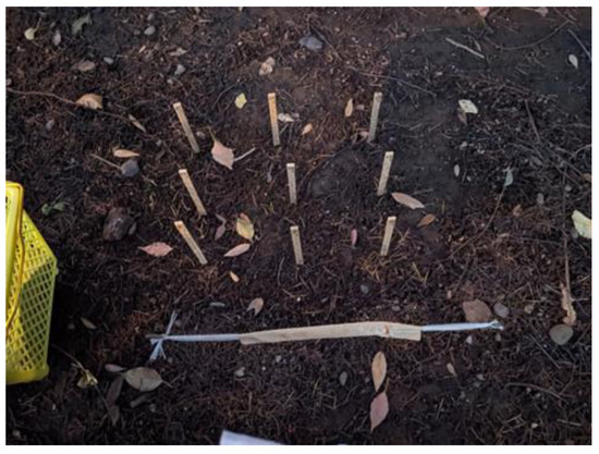 To evaluate the biodegradability of the bio-polyurethane foam (PUF) derived from the liquefied product, weight reduction of the foam specimens was monitored over a 12-month period under two distinct environmental conditions: a temperature- and humidity-controlled chamber and a field environment. Each PUF sample was sectioned into 1 cm³ cubic specimens, and initial weights were recorded. Biodegradability assessments were conducted at monthly intervals for up to 12 months. To ensure the reliability of biodegradability evaluations under soil burial conditions, the thickness of bio-polyurethane foam specimens was standardized to 1 cm, as variations in thickness—whether excessive or insufficient—can significantly influence the degradation kinetics and compromise the validity of experimental results [39]. A total of 18 samples, with three replicates per condition, were buried in soil under both outdoor and chamber conditions. For the field environment, a 15 cm-deep hole was dug on-site, and the samples were buried at a depth of 10 cm from the ground surface. As shown in Figure 1, the pole was set to indicate the places.