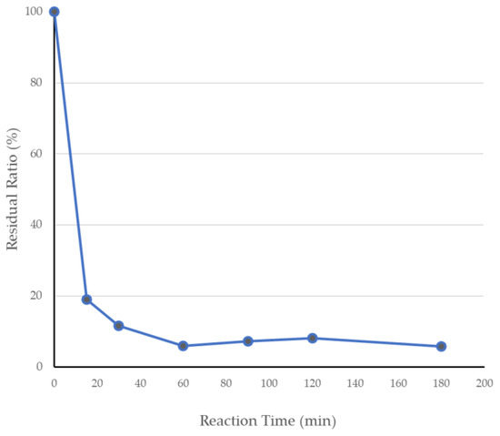 The residue ratio was determined by collecting liquefied samples at 15, 30, 60, 90, 120, and 180 min after the addition of the sulfuric acid catalyst. At each time point, two aliquots of liquefied material were collected into pre-weighed vial bottles. The collected samples were immediately quenched in an ice-water bath to halt the reaction, followed by the weight measurement. The weight difference between the empty vial and the vial after sample collection was recorded as the mass of the recovered liquefied material. Subsequently, the weight of thoroughly dried filter paper was measured, and vacuum filtration was performed using this filter paper to separate the residue from the liquefied material. The residue was then washed with methanol, and the filter paper was dried before being weighed again to determine the residue mass. The residue ratio for each sampling time was calculated using the recorded values of the liquefied material weight and residue weight according to Equation (1).