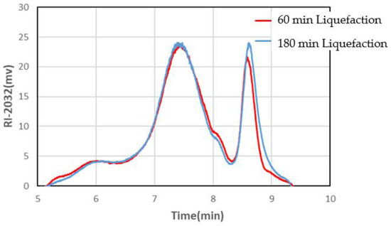 Figure 5 presents the weight-average molecular weight (MW) and molecular weight distribution (Mn/Mw) of the liquefied products obtained at 60 and 180 min, as measured via GPC, with the results summarized in Table 5.