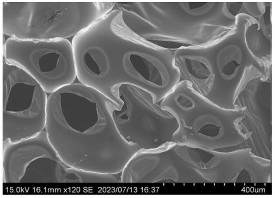Figure 6 shows the bio-polyurethane foam produced from the liquefied product. The formulation consisted of 15 g of liquefied product, an isocyanate ratio of 1, and 1 g each of a foam stabilizer, water, and DBDTL. The surface of the foam was smooth, with a sponge-like texture and elasticity, demonstrating good resilience under stress. Additionally, SEM observations of the foam cross-section revealed a fine and uniform cell structure. Figure 7 presents the SEM images of the foam cross-section with zooming at ×120. Cell sizes were measured from the SEM images, and the size was in the 300 to 500 μm range.