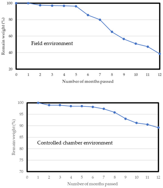 For the controlled chamber environment, plastic containers were filled with commercial gardening soil. Cavities were created in the soil matrix, and specimens were buried at a depth of 10 cm. The containers were subsequently placed within an environmental chamber (LPH-350P, Nippon Medical & Chemical Instruments Co., Ltd., Osaka, Japan) maintained at 24 °C and 60% relative humidity. At monthly intervals, all specimens were retrieved from the soil, cleaned using ultrasonic treatment, and dried for 24 h prior to gravimetric analysis. The weight loss ratio was calculated for each monthly period based on the obtained mass data. The calculation formula employed is presented in Equation (4).