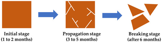 The weight reduction in field conditions revealed a significant decrease starting after six months. As seen in Figure 8, samples retrieved from the soil after six months showed substantial disintegration, with some samples losing their original shape. The weight loss pattern indicated an initial slight reduction in the first one to two months, followed by a stabilization period of about three months, and then a significant decrease afterward. This suggests that the progression of biodegradation and weight loss is not strictly proportional. However, since the biodegradation experiment in this study started in December (winter), as shown in Figure 9, the third stage coincided with Japan’s warm and humid rainy season. This suggests that the rate of stage progression may vary depending on the season. This seasonal influence may also explain why the samples put in a chamber with a constant temperature and humidity exhibited different results without distinct biodegradation stages. Additionally, the gardening soil used in the experiment may have contained fewer microorganisms capable of degrading bio-polyurethane. Based on this concept, the biodegradation of the bio-polyurethane foam appears to occur in distinct stages. In the biodegradation of polyurethane, ester bonds—being more susceptible to hydrolysis—are believed to degrade first [40,41], followed by the breakdown of urethane linkages. Accordingly, in the initial phase (1–2 months), the partial hydrolysis of ester bonds occurs preferentially; however, the material largely retains its structural integrity. In contrast, as hydrolysis progresses further and reaches the urethane linkages (after approximately 3–5 months), no significant weight change is detected. By 6 months, when the degradation of urethane bonds becomes prominent, the foam is no longer able to maintain its original shape, resulting in substantial weight loss. A schematic representation of these stages is illustrated in Figure 10.