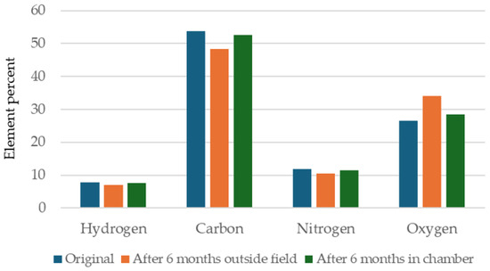 To further assess biodegradability, the elemental composition was tracked using a CHN elemental analysis, with the results presented in Figure 11.