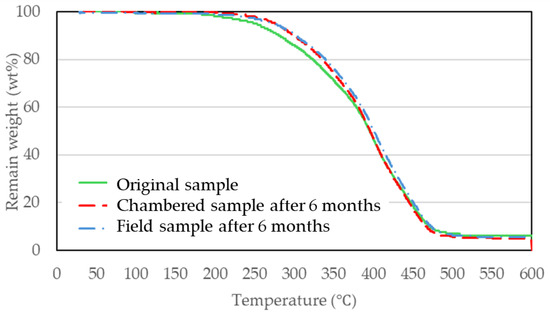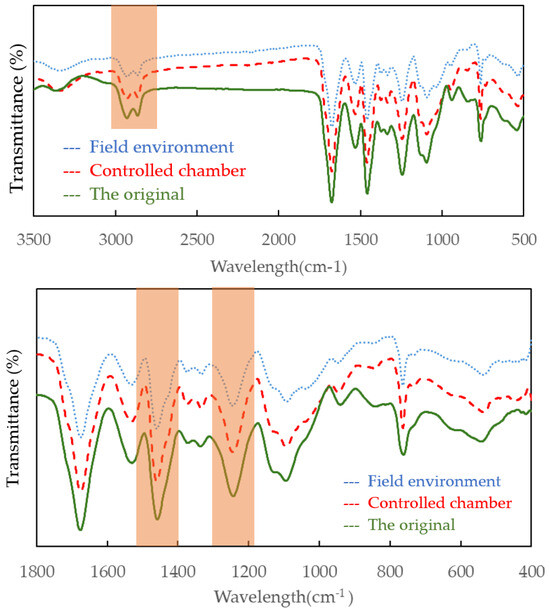 The FT-IR spectra indicated that the hydrolysis-induced cleavage of carbon chains and insertion of hydroxyl groups led to changes in peak intensities corresponding to the relevant functional groups (ester C-O bonds at 1210 and 1100 cm−1, Amide II bands at 1530 cm−1, and hydroxyl groups at 3300 cm−1). Compared to the original sample, the biodegraded samples showed decreased intensities in ester and C-N bond peaks and an increased intensity in hydroxyl group peaks. Furthermore, peak intensities followed the following order: original sample > controlled chamber sample > field sample, which corresponded to the degree of biodegradation [42,43]. Under field environmental conditions, a reduction in the peak intensity associated with ester bonds (at 1700 cm−1) and Amide II bands (at 1530 cm−1), indicative of biodegradation, was observed. In contrast, samples maintained in a temperature- and humidity-controlled chamber exhibited no discernible changes in the intensity of these peaks compared to the original specimen, nor was any weight loss detected. These results suggest that biodegradation did not occur under the controlled conditions.