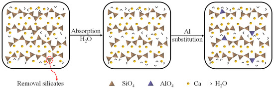 Hydration reactions accompany the whole process of Qn species evolution [56]. Under external forces, H2O moves to the silicate tetrahedra and forms hydrogen bonds [64], which promote the dissociation of H2O to produce H+ and OH−. H+ binds to ONB to generate Si-OH groups, while OH− coordinates with interlayer Ca2+ ions to generate Ca-OH groups [50]. In addition, the hydrolyzed H+ is transferred to the ONB of Al-O-Si to generate Al-OH and Al-O(H)-Si [56] instead of directly generating Al-OH and Si-OH. This implies that a structural rearrangement occurs under external forces, thus slowing down the crack development [57]. At high strains, the hydrolysis process of Si-O-Ca and Si-O-Si bonds is relatively easy (see Equations (4) and (5) [65,66]), whereas hydrolytic fracture of Al-O-Si bonds is a complex process (see Equations (6) and (7) [50]).