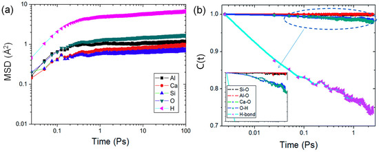 The strength of chemical bonds relies on their stability to a great extent; time-correlated function (TCF) is capable of analyzing their stability and dynamics. As indicated in Figure 5b, Hou et al. [56] reported that C(t) values of Al-O and Si-O stay near 1, indicating the aluminate-silicate local structure has good stability. The C(t) value of the Ca-O bond decreases slightly, which is caused by the cluster formation of interlayer Ca with H2O increasing the diffusion rate of Ca and leading to easy breakage of the Ca-O bond.