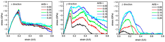 Like CSH, the CASH structure has anisotropy as well. Cohesion in the x direction is generated by interacting the silicate with the CaO layer, while the Ca-O-Si and Si-O-Si bonds of the silicate are the source of cohesion in the y direction [50]. CASH gel has better plasticity in the y direction [56] while presenting brittleness in the z direction [53,58]. This is because the ionic covalent bonding strength of the Ca−Si chains in the y-direction is superior to the H-bond of the interlayer in the z-direction [56]. However, increasing the content of Al atoms between interlayers allows for enhancement of the mechanical properties in the z direction, achieving stress values close to or even higher than those in the x and y directions, as is shown in Table 1. This can be explained by the evolution of molecular structure under external forces in Section 2.1.2.