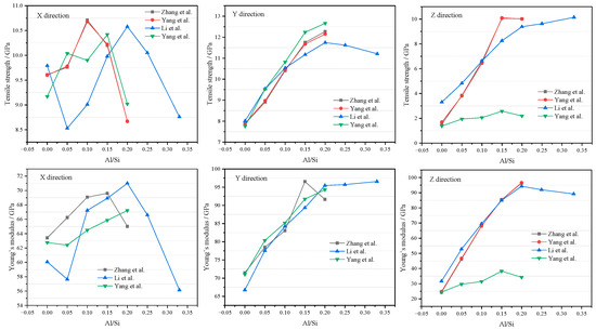The tensile strength and Young’s modulus of CASH can be predicted by MD, summarizing data from the references in Table 1. In the x direction, Young’s modulus and tensile strength show a tendency to rise and then fall by increasing the Al/Si ratio. In the y and z directions, Young’s modulus and tensile strength increase with increasing Al/Si ratio [56,58]. Figure 7 shows tensile strength and Young’s modulus (mechanical strength). In the x direction, it can be observed that mechanical strength first increases and then decreases with increasing Al content, reaching an optimal value when the Al/Si ratio is between 0.1 and 0.2. In the y direction, mechanical properties reach a maximum at Al/Si = 0.2 as Al content increases and then stabilize or decrease beyond 0.2. In the z direction, mechanical strength gradually increases with increasing Al content, which is consistent with the experimental observations obtained using high-pressure XRD technology [68], indicating that Al-induced crosslinking enhances the strength of the sample along the z direction. However, the best mechanical strength is exhibited when the Al/Si ratio is in the range of 0.15 to 0.20. Based on the above, CASH exhibits optimal mechanical properties when the Al/Si ratio is between 0.15 and 0.2. The improvement in mechanical strength is mainly attributed to the addition of aluminum, which causes cross-linking of silicoaluminates, significantly improving interlayer interactions [50,53]. At low Al content, Al atoms primarily repair defective Ca−Si sheets; at high aluminum content, a network structure forms in the interlayer region [68,69].Interestingly, when Al/Si > 0.2 (0.2~0.33), the frequent formation and fracture of hydrogen bonds between Ca−Si layers weakened the stability of the structure [54]. The tensile strength and Young’s modulus no longer increase but remain unchanged or slightly decrease. Therefore, it is better to keep Al/Si around 0.2 in cement-SCMs.