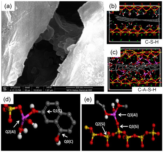 Microstructure and molecular structure of GO in CSH and CASH: (a) Microstructure of GO in the concrete interlayer, (b) molecular structure of GO in the CSH interlayer, (c) molecular structure of GO in the CASH interlayer, and (d,e) formation of covalent bonds between GO and silicoaluminate chains [77]. The silicon, oxygen, hydrogen, carbon, and aluminum atoms in the molecular structure are represented by yellow, red, white, gray, and purple, respectively.
