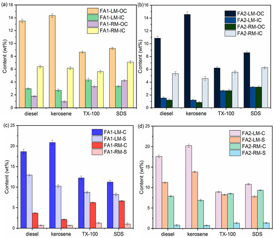 To further understand the separation of components via flotation, elemental analysis of C, N, H and S contents in LM and RM was carried out to complement the OC/IC analysis via LOI. Tables S1 and S2 in Supplementary Materials list the C, S, H and N contents of light and residual materials after flotation of FA1 and FA2 at a collector dosage of 10 g/L. The changes in N and H were statistically insignificant. Therefore, only changes in C and S are shown in Figure 3c,d. C content via elemental analysis includes both organic and inorganic carbon. C contents in FA1-LM increased to 18.65 wt% (diesel as collector) and 20.85 wt% (kerosene as collector) from the original 8.46 wt%. C contents in LM with SDS and TX-100 were much lower. For FA1, C contents in LM with TX-100 and SDS were 12.23 wt% and 11.21 wt%. Elemental analysis results also revealed significant drops in S contents in the residual fly ash and increases in S in light materials. The S contents of FA1 and FA2 originally were 2.66 wt% and 2.62 wt%, respectively. The S content in the residual materials decreased to between 0.68 wt%–1.35 wt%, while that in the light materials increased to 7.82 wt%–12.92 wt% for FA1 and FA2, as shown in Figure 3c,d. It appears that S-containing compounds were also accumulated in the light material, thus achieving desulfurization of the fly ash.