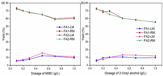 Comparison of collectors showed that kerosene may be a promising candidate with effective separation of organic carbon and S from fly ash. In the comparison of frothers, kerosene was used as a collector by varying the frother (MIBC and 2-Octyl alcohol) and dosage. Figure 4 shows the variation in LM and RM yields with respect to frother dosage. There is a general trend of an increase in the yield of LM from 0.1 g/L to 0.5 g/L. Correspondingly, the yield of RM decreased at this range. Yield of LM decreased slightly or stabilized at a dosage greater than 0.5 g/L. High dosage means more bubbles. They tended to collide with each other more, thus adversely affecting the adhesion between the air bubble and particles [32]. In this research, considering the yield of both LM and RM, a frother dosage of 0.5 g/L seems to be optimal. In addition, the behavior of FA1 and FA2 was similar, indicating that the variation in fly ash did not significantly change the effects of the frother.