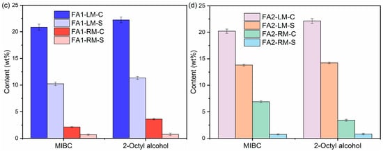 The contents of organic carbon, inorganic carbon, C and S of LM and RM at a frother dosage of 0.5 g/L with kerosene as collector are presented in Figure 5. There are only slight differences in C and S separation from fly ash into light material with MIBC and 2-Octyl alcohol as frothers. For example, the OC values in FA1-LM were 14.35 wt% and 13.53 wt% with MIBC and 2-Octyl alcohol, respectively. The C contents were also similar at 20.85 wt% and 22.23 wt%. OC and C contents in FA2-LM also increased obviously, as shown in Figure 5b,d. Table 3 lists the values of ηOC, γc and γs with different frothers. It appears both are effective in the enrichment of organic carbon in light material. ηOC with MIBC and 2-Octyl alcohol for FA1 were calculated to be 81.69% and 75.34%. In addition, in general, MIBC as a frother performed better than 2-Octyl alcohol in the removal of carbon and S-containing compounds.