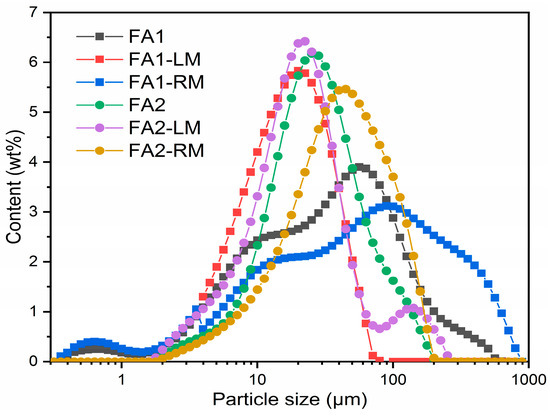 Figure 6 is the particle size distributions of the original FA1, FA2, light and residual materials from flotation. There is an obvious accumulation of smaller particles in the light materials for both fly ashes. Particle sizes of FA1-LM and FA2-LM peaked at 20 μm, while FA1-RM and FA2-RM centered at approximately 40 μm and 100 μm, respectively. The average particle sizes of FA1, FA1-LM and FA1-RM are 35 μm, 16 μm and 80 μm, while those of FA2, FA2-LM and FA2-RM are 30 μm, 20 μm and 76 μm, respectively. The distribution of particles proved that flotation was able to separate smaller particles. The residual fly ashes were larger in size.