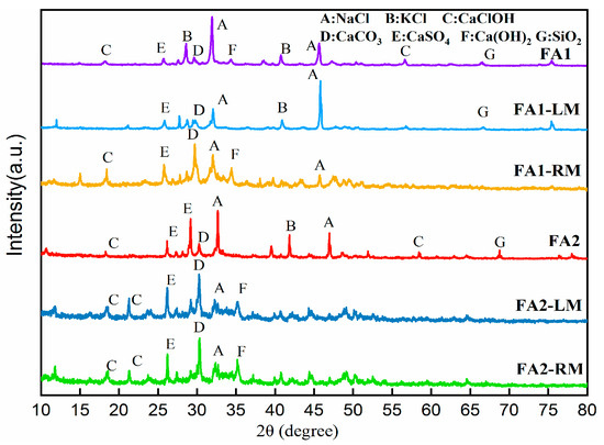 For the effects of flotation on the separation of heavy metals, the digestion method was used to analyze heavy metals in fly ash, light and residual materials. Results are shown in Table 5. Six heavy metals (Zn, Pb, Cd, Cu, Cr and Ni) were detected in the original fly ashes. Others, such as Sr and Sn, were found in very trace amounts. Among them, Zn had the highest content in both ashes, followed by Pb and Cd. Flotation showed enrichment of heavy metals in light materials. Figure S1 in the Supplementary Materials is the distribution of heavy metals in particles of different size ranges. It showed that more than 80% of almost all heavy metals were found in particles of less than 100 μm. In particular, Pb, Cd, Ni and Cu were predominantly found in particles sized between 1 μm and 10 μm, while 30–40% of Zn was found in these particles. Therefore, the removal of smaller particles was effective in removing heavy metals, thus detoxifying fly ash. As shown in Table 5, the contents of Pb decreased to 0.45 g/kg and 0.22 g/kg for FA1-RM and FA2-RM, respectively. Other heavy metals also witnessed drops, although to different degrees.