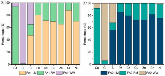 Distribution of main elements and heavy metals after flotation: (a) FA1; (b) FA2.