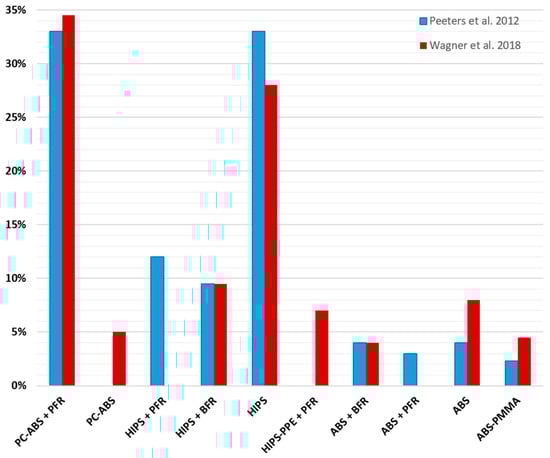 We mentioned in a previous paragraph that comparison between studies was difficult because of differences between the studied waste streams. Peeters et al. (2012) [] and Wagner et al. (2018) [] both investigated back covers of flat screens TVs within the same research group, with a 4-year time gap. This allowed for an interesting comparison of the evolution of end-of-life polymers. The study from 2012 was conducted on 100 objects and the study from 2018 was conducted on 2500 objects. The results for each study are reported in Figure 1.