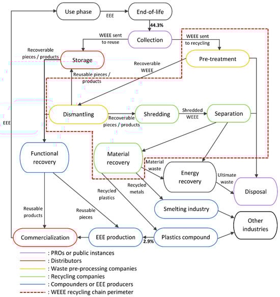 - Horta Arduin, R. From Waste Management to Supplier of Secondary Raw Materials: Development of Indicators to Support WEEE Chain Management-Focus on the French System. Ph.D. Thesis, ENSAM, Paris, France, 2020. Available online: https://pastel.archives-ouvertes.fr/tel-02924750/document (accessed on 12 October 2022).