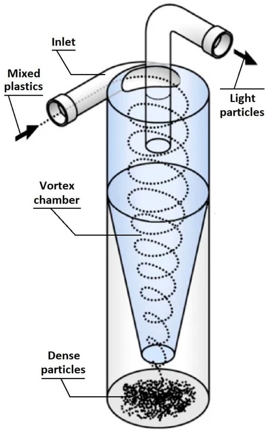 - Fu, S.; Qian, Y.; Yuan, H.; Fang, Y. Effect of cone angles of a hydrocyclone for the separation of waste plastics with low value of density difference. Waste Manag. 2022, 140, 183–192. [Google Scholar] [CrossRef]