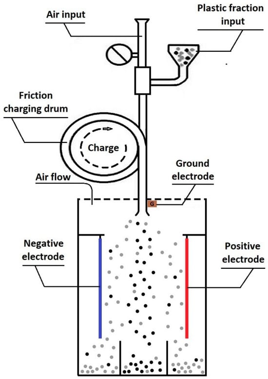 - Calin, L.; Cătinean, A.; Bilici, M.; Dăscălescu, L.; Samuilă, A. Electrostatic separation of HIPS/ABS and HIPS/ABS-PC plastic mixtures from IT equipment using fluidized bed tribocharging. Part. Sci. Technol. 2022, 40, 113–122. [Google Scholar] [CrossRef]