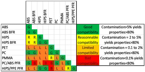 To sum up, even though exact values are hard to obtain, the main polymer types and their approximate share can be clearly identified. The Sofies report proposes a majority of PP (20%) closely followed by ABS and HIPS/PS (19% and 18% respectively). These three major polymers are followed by PC and PC/ABS blends of around 7% and finally accounting for around 0–2% of the flow each, PUR, PA, PMMA, and many others. These are very rough estimates and do not represent the exact reality of any recycling plants Other sources tend to consider the ABS and (HI)PS stream to be higher at around 30%. ABS is used for its impact toughness and is mainly found in IT equipment and screens, sometimes in a blend with PC. HIPS and PS are popular for all equipment except large household appliances. Finally, PP is found almost exclusively in large household appliances and equipment that heat up (i.e., kettle, irons, etc.). Out of these main polymer types, ABS and HIPS contain BFR more often than PP which leads to more balanced final outputs of recycled plastics more balanced between ABS, HIPS/PS and PP as evidenced by (Liu et al., 2022) in China []. Similar trends can be expected in Europe, where recycling is organised according to legislation mainly implemented by the EU.