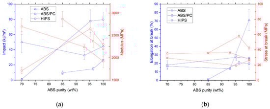 Stenvall et al., (2013) also studied the output of a sorting plant and recorded the composition and contamination level of the obtained plastics []. They found high proportion of styrenics as PS and HIPS account for 42 wt% and ABS for 38 wt% while PP represents 10 wt%. They also reported considerable deviation of 21.4%, 16.5% and 60.7% (respectively), underlining the important variation even in a single batch [].