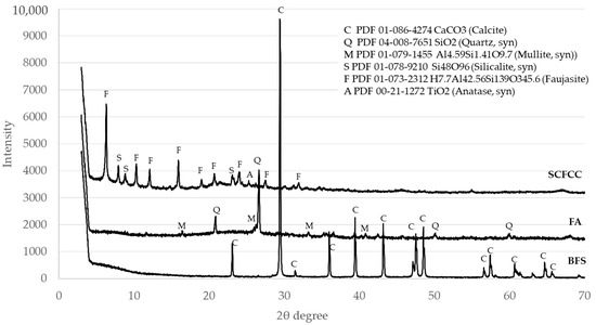 XRD patterns of the three raw materials are detailed in Figure 1. DIFFRAC.EVA software estimated the amorphous content of the analysed materials. The contents of the amorphous phase of the BFS, FA and SCFCC were 13.2%, 50.7% and 40.8%, respectively. Calcite (PDF 01-086-4274) was the only mineral phase in the BFS, which came from an enrichment in calcium of the BFS by the incorporation of calcium carbonate made by the producer. Quartz (PDF 04-008-7651) and mullite (PDF 01-079-1455) were the main minerals found in the FA. Anatase (PDF 00-21-1272), silicalite (PDF 01-78-9210) (an MFI-type zeolite) and faujasite (Al reduced (hydrogen aluminium silicate) (PDF 01-073-2312)) (an US-Y zeolite) were found in the SCFCC.