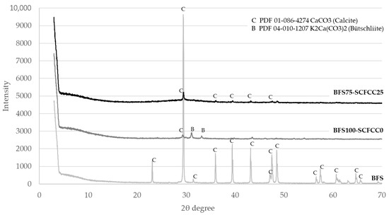 Diffractograms of BFS- and FA-based AAMs are shown in Figure 2 and Figure 3. The XRD patterns of BFS100-SCFCC0 show the presence of calcite (PDF 01-086-4274) and bütschliite (PDF 04-010-1207). The amorphous content of the BFS100-SCFCC0 AAM was 55.6%. The XRD patterns of BFS75-SCFCC25 only showed calcite as a mineral phase. The amorphous content was 61.3%. The X-ray diffractograms of FA100-SCFCC0 showed the presence of quartz (PDF 04-008-7651), mullite (PDF 01-079-1455), kalicinite (PDF 00-012-0292) and gonnardite (a potassium aluminium silicon oxide hydrate) (PDF 04-017-3349). The amorphous content calculated by DIFFRAC.EVA software was 52.3%. The XRD patterns of FA75-SCFCC25 also showed quartz and mullite. No other crystalline phases were visualized, and the amorphous content was 56.6%.