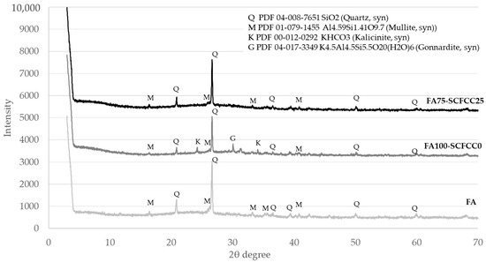 X-ray diffractograms of FA, FA100-SCFCC0 and FA75-SCFCC25.
