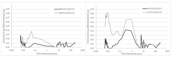 As can be seen in Table 1, the AAM based on BFS (BFS100-SCFCC0) was less porous than the FA-based one (FA100-SCFCC0). Regarding to the evolution with time, from day 1 to day 28, a decrement of porosity happened in all the AAMs. BFS-based AAMs presented densities of 2311 ± 23 kg/m3 (BFS100-SCFCC0) and 2025 ± 22 kg/m3 (BFS75-SCFCC25). FA-based AAMs presented densities of 1973 ± 21 kg/m3 (FA100-SCFCC0) and 1776 ± 13 kg/m3 (FA75-SCFCC25) at 28 days of curing. Figure 4 shows the pore size distribution (PSD) at 28 days of curing. Different PSD of AAMs based on BFS and FA can be observed. BFS100-SCFCC0 shows certain bimodality with two peaks of pore volume around 10 µm and 0.01 µm, and with almost no pores between 0.1 and 5 µm. FA100-SCFCC0 shows a trimodal patterns, with the highest concentration of pores around 0.01 µm, between 0.07 and 5 µm and higher than 10 µm.