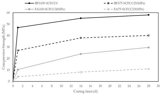 Regarding the evolution with the time, a great increment of compressive strength is observed in one day in BFS-AAM, reaching almost the maximum value of compressive strength at 14 days, with a slight increase of CS from 14 days to 28 days. However, for FA-AAM, the maximum values were reached later, at 28 days. The incorporation of SCFCC into the matrix led to a reduction in the reaction rate at the early stages (1 day). From day 1 to day 28, the curves with and without SCFCC follow the same trend.