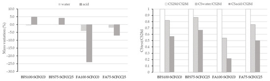 The results of CS variation expressed as the ratio between the CS after the test and the initial CS at 28 days, are presented in Figure 6 (right). As can be seen, there was a decrement of CS after the immersion in water and acid of the four AAMs. The FA-AAMs were less resistant than the BFS-AAMs, which is due to the high mass loss visualized in Figure 6 (left). The incorporation of SCFCC led to lower reductions of the CS ratio.