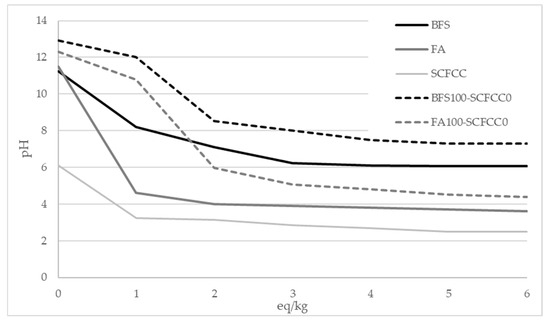 To further investigate the behaviour of the materials, the acid neutralization capacity of the raw material (BFS, FA, and SCFCC) and BFS100-SCFCC0 and FA100-SCFCC0 were evaluated using the GANC test [38]. Figure 7 presents the relationship between the pH of the samples and the amount of acetic acid added (expressed as equivalents per kilogram of material). This analysis provides insights into the buffering capacity and chemical stability of the AAMs under acidic conditions. As can be seen, BFS exhibited a higher acid neutralization capacity than FA, as evidenced by the lower pH variation per eq/kg of acid added and the gentler slope of the neutralization curve. SCFCC presented pH value in the range of 3–6, with the value of pH practically constant between 1 and 6 eq/kg. BFS100-SCFCC0 and FA100-SCFCC0 AAMs exhibited the same behavior as their respective precursors.