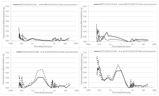 The water immersion produced an increment of porosity, more pronounced in FA-AAMs than in BFS-AAMs and less important in AAMs with SCFCC. However, the acid immersion produced different effects in BFS- and FA-AAMs: a reduction of porosity in BFS-based AAMs and an increment of porosity in FA-ones. Figure 8 shows the pore size distribution of BFS-based AAMs and FA-based AAMs before and after the acid immersion.