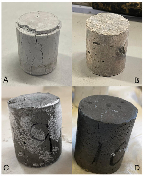 Samples after acid attack. (A) BFS100-SCFCC0; (B) BFS75-SCFCC25; (C) FA100-SCFCC0; and (D) FA75-SCFCC25.