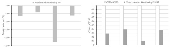 Mass variation (left) and compressive strength ratio (right) after the accelerated weathering test.