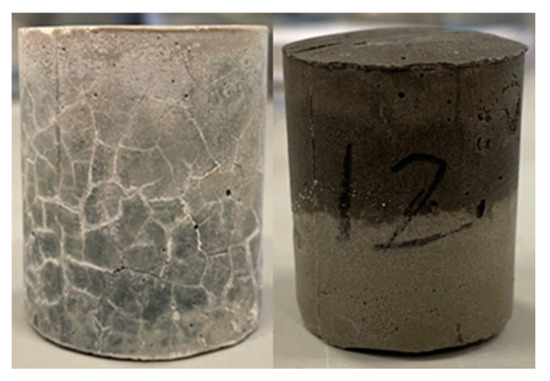 Figure 11 shows photographs of BFS100SCFCC0 (left) and FA100SCFCC0 (right) after the simulated warm-humid conditions. As can be seen, the BFS100SCFCC0 shows external cracks while the FA100SCFCC0 shows some swelling. The effects observed in the current test are comparable to those of steam curing, suggesting that similar outcomes could be achieved. Studies [58,59] on the effect of steam curing in concrete showed that the rapid temperature changes and moisture gradients during steam curing contribute to internal stresses. This leads to microcrack development including pronounced volumetric deformation, shrinkage, surface microcracking, pore structure coarsening and reduced long-term durability.