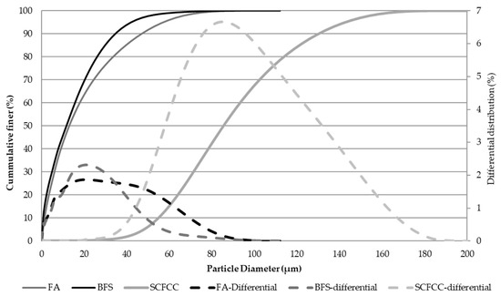 The SCFCC also contains P2O5 (3.21 wt%), La2O3 (0.79 wt%), Ni2O3 (0.18 wt%), and TiO2 (1.90 wt%), completing the total to 100 wt%. As can be seen, FA shows an elevated amounts of SiO2 and Al2O3, while BFS is mainly a source of CaO and SiO2. SCFCC also show SiO2 and Al2O3 as main oxides.