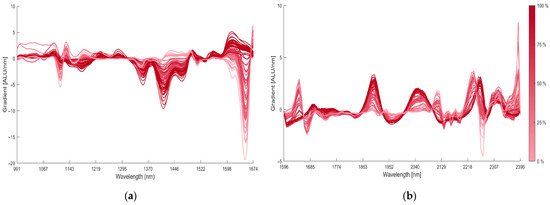 Mean pre-processed spectra shown as the first derivative of absorbance (gradient [ALU/nm]) versus wavelength of various polyester/cotton blends (0–100% cotton), where lighter spectra represent lower cotton content and progressively darker spectra correspond to higher cotton content (a) measured using a lab-scale NIR sorter and (b) measured using a handheld NIR spectrometer.