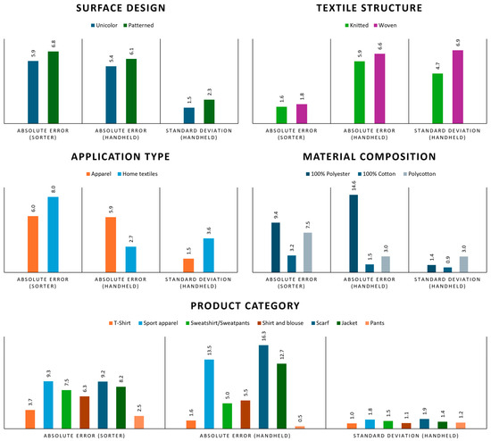 Regarding the application type, significant variation is evident across both instruments. The NIR sorter shows higher absolute errors for home textiles, while the handheld NIR spectrometer performs least accurately on apparel. Home textiles also show greater standard deviation, likely due to their common use of woven fabrics. In contrast, the higher error for apparel may come from greater variability in different treatments and dyeing processes, which are often less standardized. These differences highlight how structural and chemical variations across application types can influence NIR signal response and prediction accuracy. Differentiating between categories allows for a more targeted evaluation of model robustness, supporting future adaptation of quantification methods to the specific characteristics and challenges of each stream.