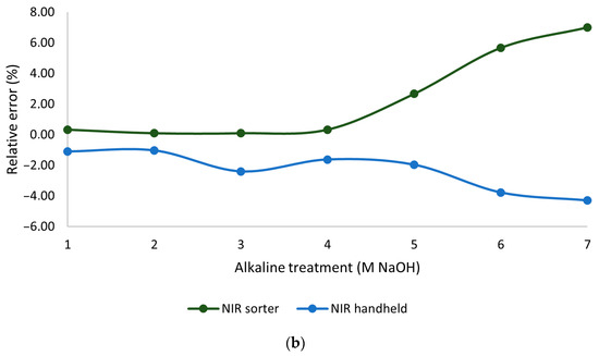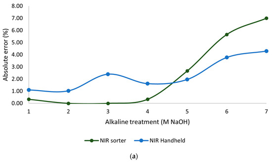 The influence of alkaline treatment under varying molarities was tested using previously trained quantification models, and the resulting absolute and relative errors per sample are shown in Figure 6. A noticeable increase is observed in absolute errors (Figure 6a) at higher molarity levels. For the NIR sorter, the shift becomes particularly evident between 4 and 5 M, marking a distinct change in performance. In contrast, the handheld NIR spectrometer does not exhibit a clear trend; however, a similar increase in error is apparent starting from 5 M. This observation is further confirmed by the acquired spectra (Figure 7).