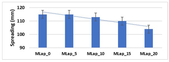 The workability of mortars containing volcanic lapillus decreases as the replacement percentage increases; this is due to the physical property of volcanic lapillus, namely, residual porosity [], which tends to absorb water, making the mixture more viscous. The obtained values are close to the reference (MLap_0) up to the inclusion of 10% lapillus. At 15% the value further decreased, but still it could be considered acceptable. With the substitution of 20% lapillus, there is a marked decrease in the value related to the measure of spreading resulting in low workability of the paste.