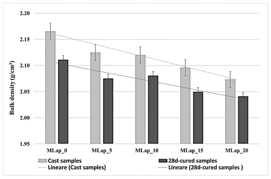 The geometric or bulk density was calculated a few minutes after casting the samples in the mold and 28 days of curing. This measurement was performed because lapillus, being less dense than cement, should contribute to the lightening of the material. The aim was to check whether this lightening effect was maintained after a curing period.