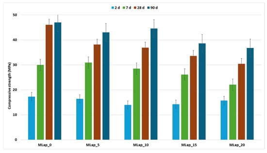 The compressive strengths of the produced mortars are shown in Figure 3; the values indicated are average values and are associated with the standard deviation.