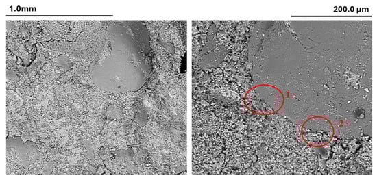 SEM images of the 2-day aged reference sample at 80× (left) and 300× (right). The red circles represent a good gel–aggregate adhesion (1) and a less pronounced bond (2).