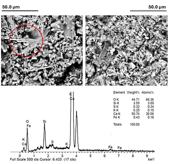 Figure 5 at higher magnification (1200×) shows on the left the presence of needles, approximately 25–30 μm in size, and on the right the formation of cement gel, indicating that hydration processes are underway. In the same figure below, the eds spectrum performed on the area highlighted in red can be observed.