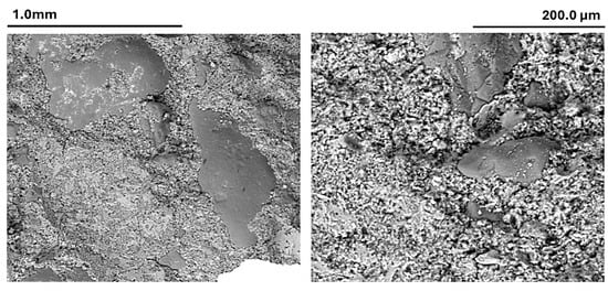 Figure 6 shows the microstructure of sample MLap_20, which contains 20% lapillus instead of cement. Figure 6 shows granular regions that are clearly visible in the 300× magnification image on the right.